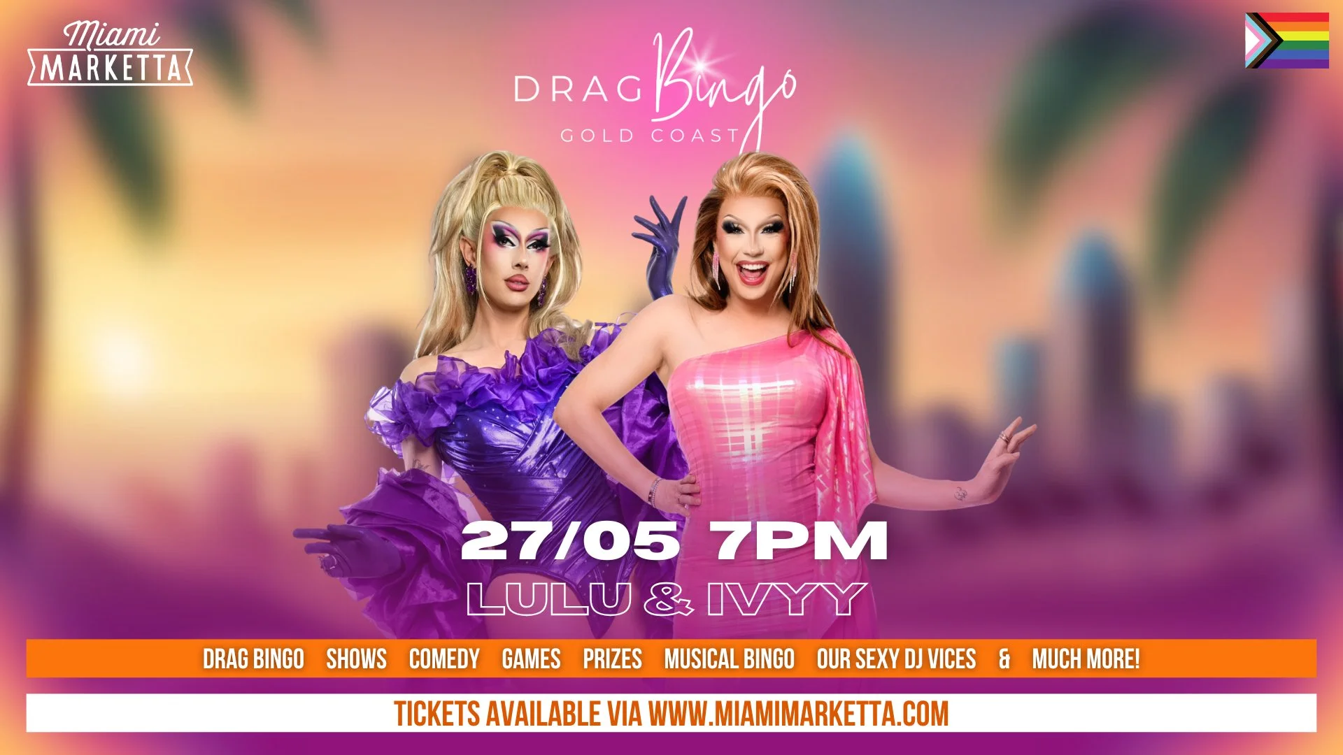 The party comes to you with our exclusive Drag Bingo-themed cocktails delivered straight to your table, plus feast your way through the incredible street food vendors at Miami Marketta.